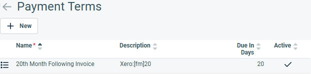 3. When naming the payment term, enter "20th Month following" or similar. In the description field, input the merge field Xero:[fm]20. For the due in days section, enter 20 to indicate payment is due on the 20th of the following month.