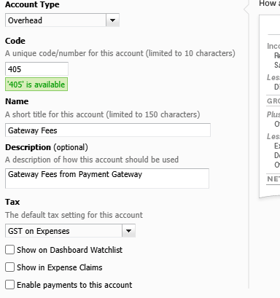 If you don't already have one, create an Expense/Overhead account in Xero for "Gateway Fees." In most cases this account will be subject to tax but please consult your accountant for the correct tax treatment in your region.