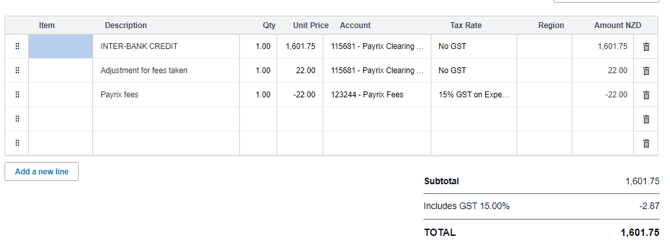 Verify: The "Total" at the bottom should now exactly match the "Net" amount received in your bank feed.