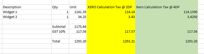 The spreadsheet below shows the impact of rounding at 2DP vs 4DP on a simple 2 line invoice.