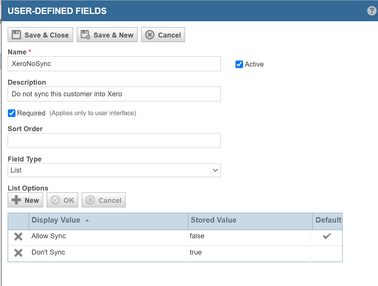 Under User Defined, locate the XeroNoSync field you created earlier and set its value according to your requirements.