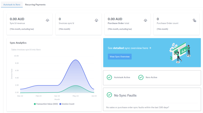 The dashboard provides an "at-a-glance" look at your monthly sync volume and the connectivity status of both Autotask and Xero. To manage your data in detail, click the blue View Sync Overview button.